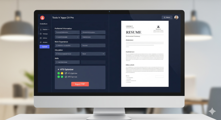 Tools ‘n’ Apps CV Pro is a sophisticated, single-page web application designed to provide a premium, “What You See Is What You Get” (WYSIWYG) experience for creating professional resumes. It replicates the functionality of high-end SaaS platforms by combining interactive form-based data entry with a real-time, high-fidelity document preview.